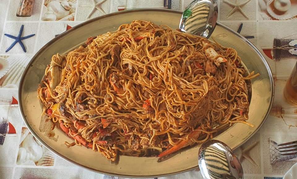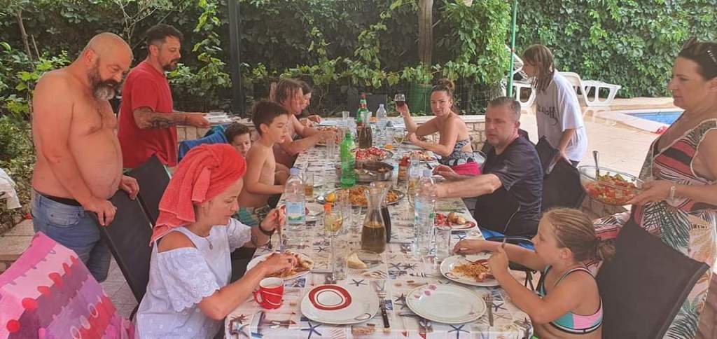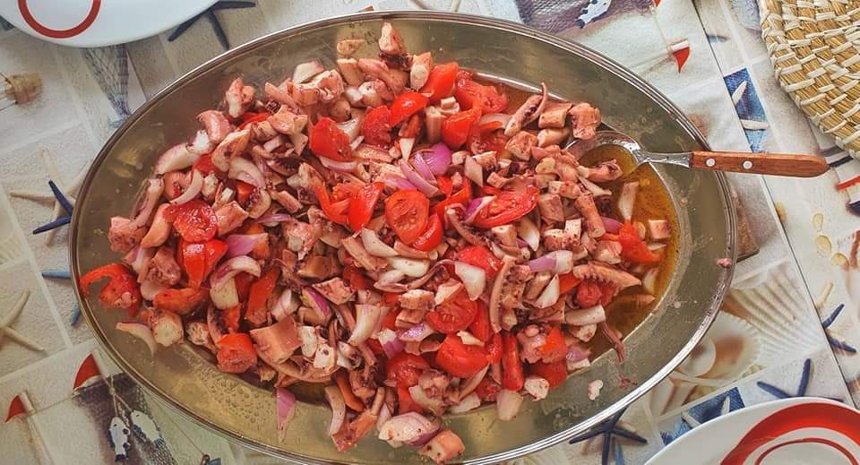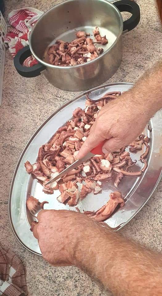 Spaghetti z krabami 🦂🦀i parmezanem🧀, sałatka z ośmiornicy🦑, pomidorów🍅 i czerwonej cebuli , oczywiście słusznie polana lokalną oliwą i octem winnym , oraz ośmiornice zapiekane z ziemniakami . Do tego degustacja lokalnego wina Posip- dida moj ( mój dziadek ) .